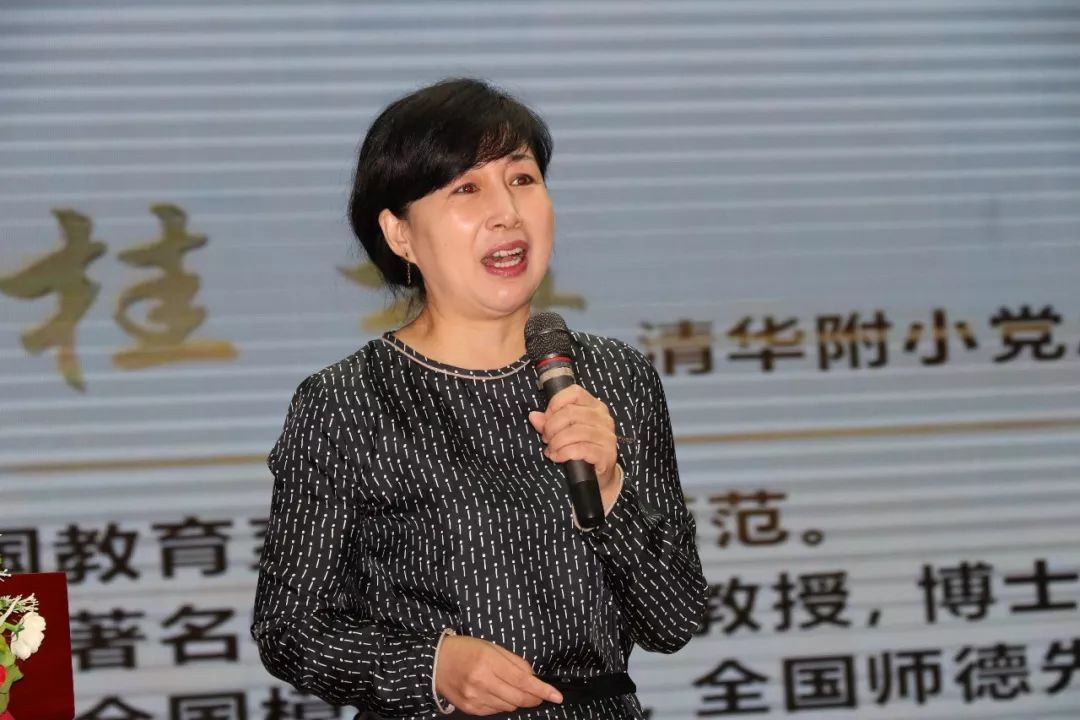 仪式结束后,宋盈校长的实践导师清华大学附属小学窦桂梅校长作了题为《让孩子站在学校正中央》的主旨报告,生动地讲述了研究实践“成志教育”的故事,阐释了“成志教育”理念,让老师们牢记:一个孩子向生命中最初的地方走去,最初的也就会成为孩子生命的一部分。